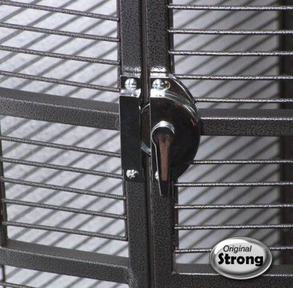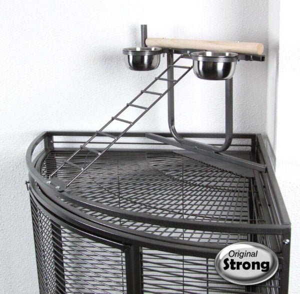Deze papegaaienkooi is geschikt voor de kleinere papegaaien en voor parkietachtigen. Het handige hoekmodel is ruimtebesparend in uw huiskamer, maar biedt uw vogel toch voldoende bewegingsvrijheid. Tevens heeft de kooi 4 stevige zwenkwielen, waardoor je deze makkelijk kan verplaatsen. De leuke playtop zorgt voor extra veel speelplezier. Met een paar leuke speeltjes erbij kan hij zich hier uren vermaken. De papegaaienkooi heeft twee uitdraaibare rvs bakjes, een uitneembaar looprooster en een hele grote voordeur met veiligheidsslot. De leuke playtop is ook voorzien van een schuiflade voor extra hygiene. Is de kooi te donker naar uw zin? Dan kunt u de bovenste schuiflade ook verwijderen voor meer lichtinval. Hieronder zit namelijk nog een traliewerk. Deze kooi bevat geen opvangranden.